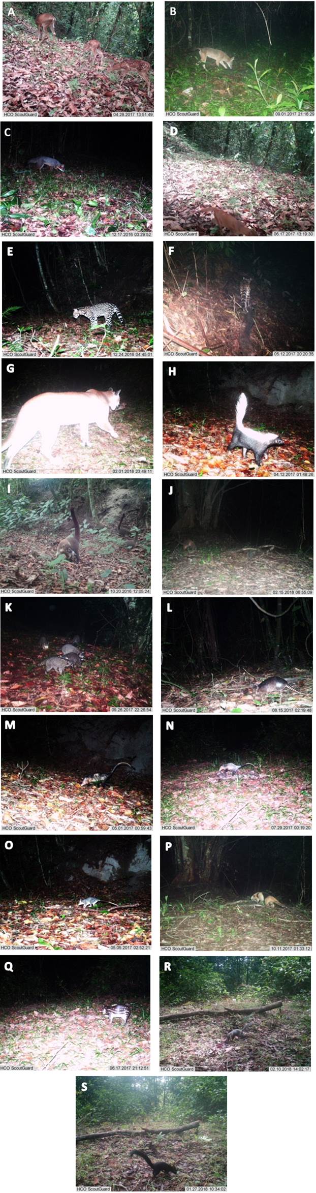 A = Odocoileus virginianus veraecrucis Goldman and Kellogg, 1940; B = Canis latrans Say, 1822; C = Urocyon cinereoargenteus Schreber, 1775; D = Herpailurus yagouaroundi È. Geoffroy Saint-Hilaire, 1803; E = Leopardus pardalis Linnaeus, 1758; F = Leopardus wiedii Schinz, 1821; G = Puma concolor Linnaeus, 1771; H = Conepatus leuconotus Lichtenstein, 1832; I = Nasua narica Linnaeus, 1766; J = Potos flavus Schreber, 1774; K = Procyon lotor Linnaeus, 1758; L = Dasypus novemcinctus Linnaeus, 1758; M = Didelphis marsupialis Linnaeus, 1758; N = Didelphis virginiana Kerr, 1792; O = Philander opossum Linnaeus, 1758; P = Tamandua mexicana de Saussure, 1860; Q = Cuniculus paca Linnaeus, 1766; R = Sciurus aureogaster F. Cuvier, 1829; S = Sciurus deppei Peters, 1864.