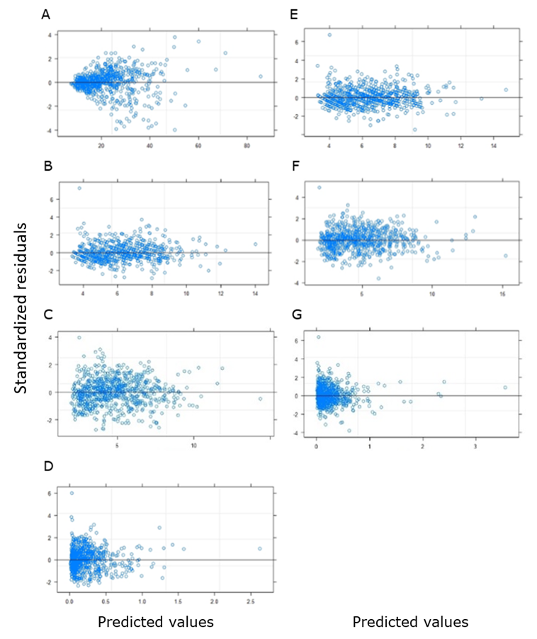 Figure 2 Graphical homoscedasticity test for the proposed models in each allometric relationship.