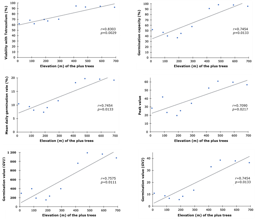 The two estimates of germination value indicated that seeds from trees located at altitudes above 400 m showed a better physiological quality, which is related to a higher germination capacity, compared to seeds from trees located at lower altitudes.