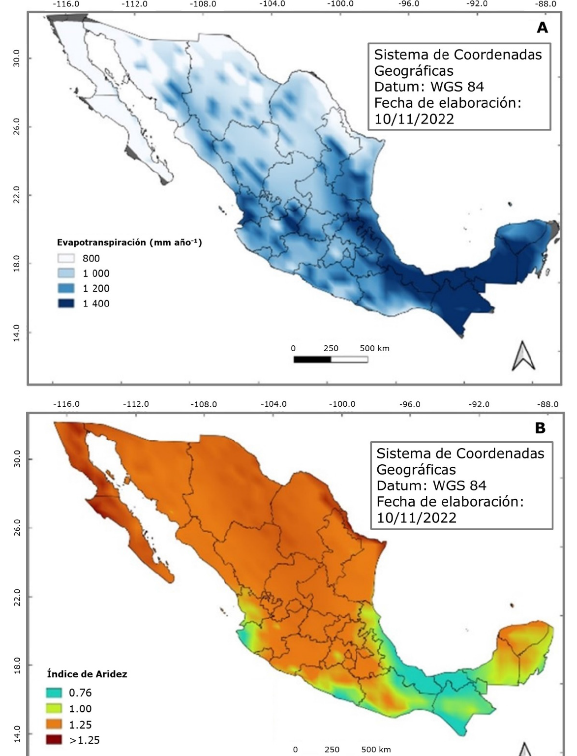A = Evapotranspiración; B = Índice de Aridez.