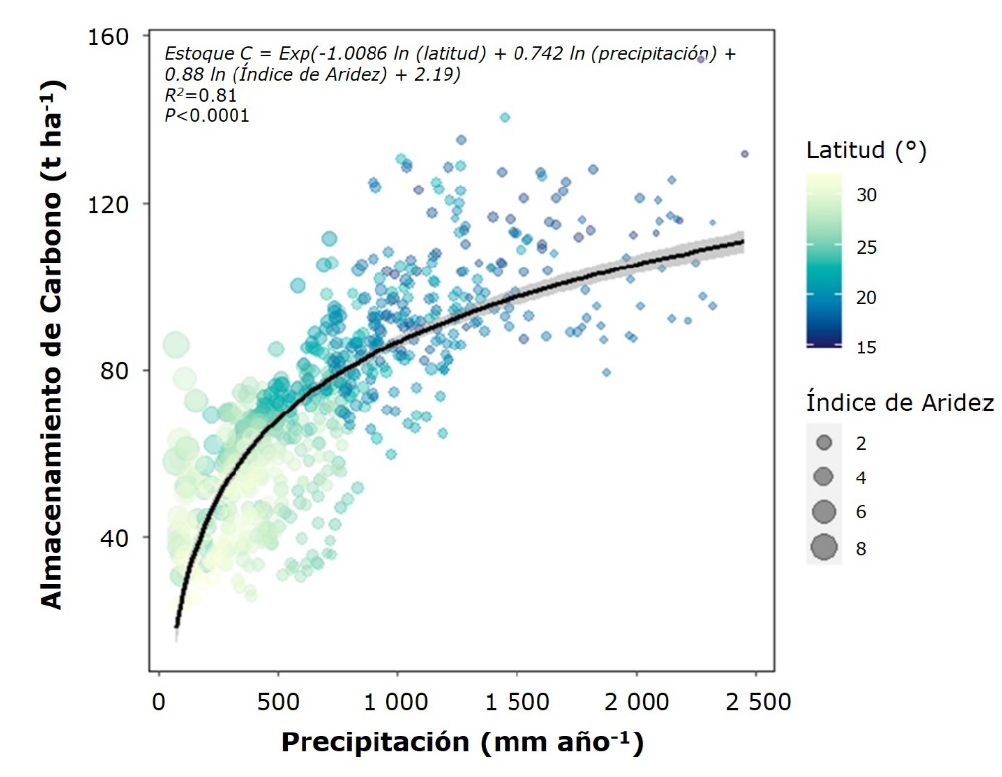 Relación entre el almacenamiento de Carbono y el Índice de Aridez y las variables edafoclimáticas