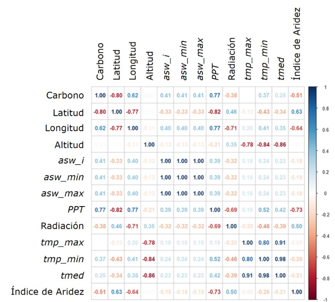 Como se observa en la Figura 4, los tres principales factores que influyen en la productividad son la precipitación, la latitud y el Índice de Aridez; estos indirectamente representan el potencial de estrés hídrico. En la Figura 5 se presenta la correlación de Pearson entre las variables ambientales con enfoque en el Carbono y el Índice de Aridez.