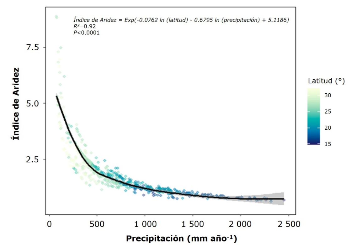 Figura 6 El Índice de Aridez en México tiene una fuerte relación con la precipitación y la latitud de acuerdo con las estimaciones de evapotranspiración del 3PG.