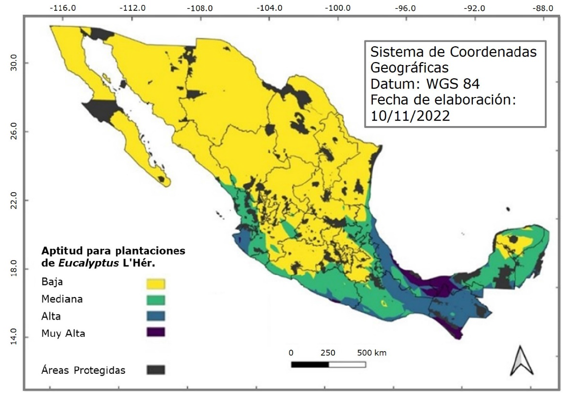 Las principales variables que controlan la productividad, almacenamiento de Carbono y el Índice de Aridez (evapotranspiración/precipitación) en México son la precipitación y la latitud. Las áreas de aptitud alta y muy alta para plantaciones de Eucalyptus, considerando el potencial productivo, así como un bajo riesgo relacionado con la modificación del balance hídrico (Índice de Aridez<0.76) suman 1.4 millones de hectáreas, lo cual confirma el enorme potencial del país para desarrollar plantaciones de Eucalyptus.