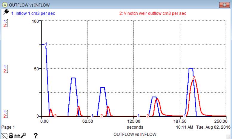 La figura 5 muestra los resultados del modelo Stella® en forma de tasas de flujo de entrada versus flujo de salida de la escotadura en V.
