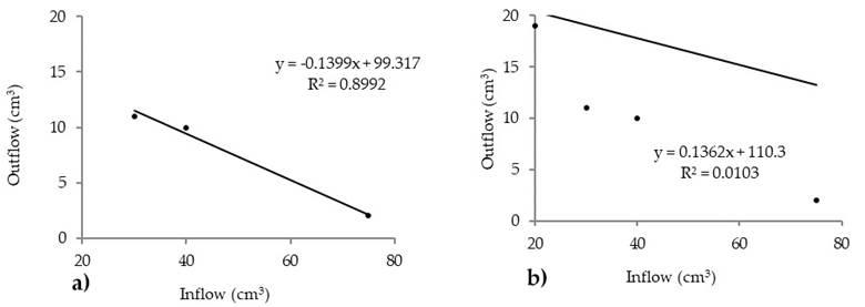 El buen ajuste entre el flujo de entrada y el flujo de salida se muestra por el cuadrado-R alto de 0.89 si los volúmenes totales de flujo de entrada versus el volumen total de los valores de salida predichos por el modelo son similares a los valores medidos para las diferentes tormentas. Sin embargo, el análisis crítico de la relación revela un error lógico. El flujo de salida disminuye a medida que aumenta la entrada, en contraste con la relación lógica establecida. La adquisición de datos adicionales mediante la aplicación de más tormentas revela que los tres puntos iniciales, aunque física y empíricamente correctos, sólo representan una pequeña parte de las relaciones complejas entre flujo de entrada y salida. Está claro que el modelo caja-negra no puede predecir con precisión las relaciones flujo-entrada sin muchos más datos, incluyendo parámetros adicionales, como las condiciones iniciales al inicio de una tormenta.