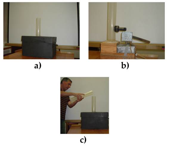 La caja-negra utilizada para este experimento (figura 3) tiene un cilindro de entrada vertical por encima de la caja-negra, que representa una sección vertical del suelo sobre la cual la precipitación podría caer como se muestra en la figura 3a. La figura 3b muestra una espiga horizontal, con una altura invertida de 7.5 cm, que permite se produzca escurrimiento a un segundo almacenamiento una vez que el cilindro esté lleno hasta esa altura. Este segundo almacenamiento representa un estanque temporal, lago o humedal con una salida controlada del sistema a través de una presa V. El agua también puede salir del segundo almacenamiento como flujo vertical a través de un pequeño tubo metálico hasta un tercer contenedor cerrado que representa un acuífero de aguas subterráneas. En este modelo no hay descarga de agua subterránea, sin embargo, se podría añadir con facilidad. Hay una descarga lenta directamente desde el cilindro de suelo simulado hasta el almacenamiento de agua subterránea a través de un pequeño tubo con una abrazadera para controlar la tasa de filtración desde el suelo; todo este sistema está representado por la figura 3b. La porosidad del suelo y/o la capacidad de infiltración se pueden cambiar añadiendo materiales como mármoles con alta o capacidad de infiltración o pequeñas cuentas de vidrio con baja o capacidad de infiltración. La figura 3c muestra la aplicación de una simulación caja-negra, arrojando agua sobre el cilindro vertical como representación de la precipitación.