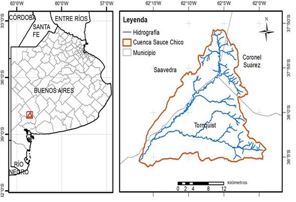 El área de estudio es la cuenca alta del río Sauce Chico (CARSCH) ubicada sobre el sistema orográfico Sierra de la Ventana, al suroeste de la provincia de Buenos Aires, Argentina (Figura 1). Abarca una superficie de 373.25 km2, que presenta una topografía muy marcada, cuyo gradiente climático y procesos geomorfológicos regulan la existencia de diferentes suelos, condiciones hídricas, vegetación y uso del suelo, e influyen sobre la dinámica biofísica, social y económica regional. La red de drenaje es del tipo subdendrítica, con marcado control estructural (Torrero & Campo, 2008). La altitud varía entre 450 y 1 200 msnm, cuya pendiente supera el 8 % en las zonas con máxima altitud, con un máximo grado de erosión hídrica (Torrero et al., 2010). La dinámica hídrica, el escurrimiento medio, supera al módulo anual de 2.02 m3/s (derrame anual de 63.70 hm3) durante los meses de marzo a mayo y septiembre a noviembre. Los caudales mensuales medios mínimos ocurren en el verano durante el mes de enero (1.30 m3/s) y los máximos en el mes de abril (2.85 m3/s), que corresponde a la estación climática de otoño (Espósito et al., 2016).
