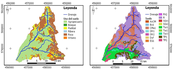 Las categorías de uso del suelo y vegetación definidas fueron las siguientes: roca en superficie (pastizal muy degradado), bosque, pastizal (en buen estado), zona de ribera, agropecuario y urbano, cuya zonificación actual se visualiza en la Figura 2 (izquierda). La superficie de ocupación de cada uso del suelo se determinó con un sistema de información geográfica.