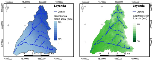 Zonificación de la evapotranspiración potencial media anual (PET) (mm) logrados del Atlas Climático Digital de la República Argentina INTA (Bianchi & Cravero, 2010), realizado para el período 1961-2010 (Figura 3 derecha).