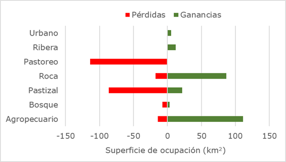 El análisis de tendencia de cambio de usos del suelo, con SIG, se basó en el procesamiento de cada mapa según momento. A partir de estos datos, se definió la superficie de ocupación para los usos del suelo del pasado (1997) y de la actualidad (2017), siendo el área con presencia de roca de 54.61/116.46 km2; el bosque se presenta en 8.67/4.05 km2; el pastizal se distribuye sobre 114.58/50 km2; el pastoreo se realizaba en el pasado en 113.90 km2; el uso agropecuario se extiende en 81.47/184.81 km2, y en la actualidad hay dos clases nuevas, que son la zona de ribera de 12.34 km2 y el área urbana que se expande sobre 5.57 km2. La modelización con LCM permitió evidenciar las ganancias y pérdidas, cambio neto, y persistencia de transiciones específicas del uso y cobertura del suelo en el periodo de 20 años. En 2017, la agricultura ocupó el 49 % de la cuenca (185 km2) desarrollada sobre áreas de pastoreo y pastizal en 1997; cambiaron su situación de uso, siendo ambas ocupadas por uso agropecuario mixto. En total se perdieron 64 km2 de áreas de pastizales. La planificación de la zona urbana se inició en la década de 1990, pero apenas en la actualidad se visualiza su ocupación. La zona de ribera se identifica claramente hoy día debido al cambio de vegetación dado por el pobre acceso del ganado y el aumento del uso turístico-recreativo. Las zonas urbanas y bosque de ribera ocupan < 1 % del área de la cuenca en 2017. En la Figura 4 se muestran los resultados del análisis de ganancias y pérdidas de superficie por uso del suelo entre 1997 y 2017 en la cuenca.