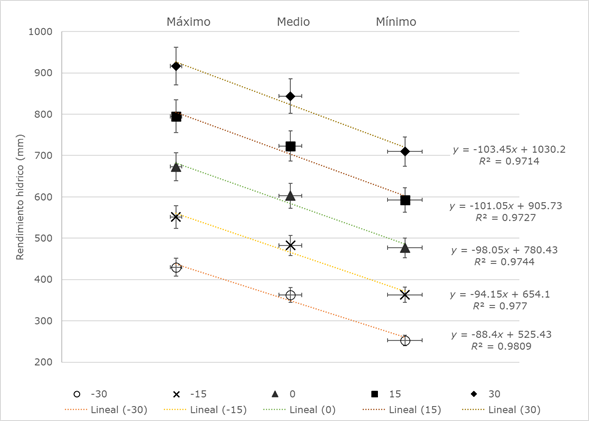 La Figura 6 muestra la variabilidad del WY en la CARSCH, en respuesta de los escenarios estudiados, indicando los valores máximos y mínimos logrados, y los resultados del análisis estadístico básico con SIG de los mapas de Figura 5. Se presenta la ecuación de regresión lineal y R 2 (porcentaje de variación de la variable de respuesta) en cada caso, que demuestra un buen ajuste del modelo a sus datos; de esta manera se establece que la cuenca reacciona de una forma ante cada escenario. Se incorporó al gráfico estadístico, el símbolo de las barras de error (al +/-5%), que indica que la concentración de valores es elevada.