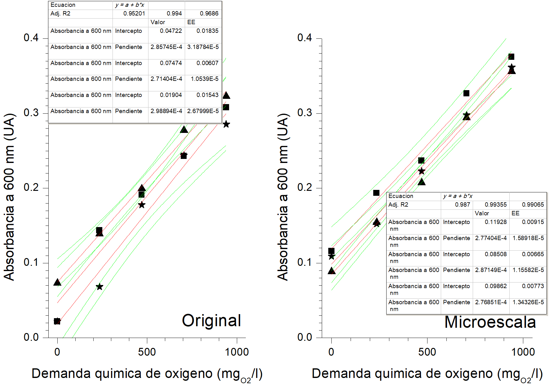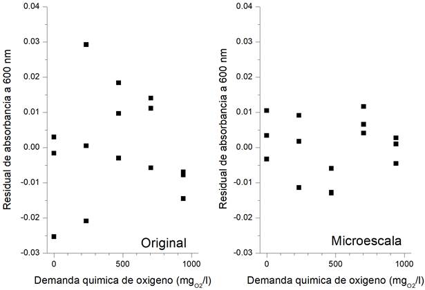 El método 5220-D adaptado a microescala fue descrito exitosamente por un modelo simple lineal en el rango de DQO de 0 a 940 mg O2/l, con base en la determinación exitosa de la linealidad (r2 > 0.98).