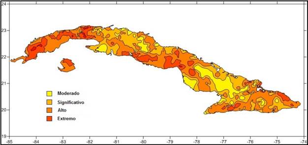 Planos, Limia y Vega (2005), y Planos et al. (2011) elaboraron un mapa de peligro (Figura 1) basado en los indicadores siguientes: lámina máxima absoluta (mm); frecuencia de láminas máximas superiores a 100 mm; lámina con periodo de retorno de 100 años (mm), y probabilidad de una lámina de lluvia ( 100 mm en dos años. En este mapa se regionaliza el comportamiento de las precipitaciones en tres zonas de peligro (alto-extremo, significativo y moderado), incluyendo un conjunto de relaciones típicas que caracterizan el comportamiento de la precipitación y su intensidad, y tablas que caracterizan las zonas determinadas. El mapa y el material complementario que le acompaña tienen un elevado valor práctico, ya que permite utilizarlo con propósitos medioambientales e ingenieriles, con particular uso en cualquiera de las aplicaciones donde el impacto de las grandes precipitaciones y las precipitaciones intensas sea nocivo, así como criterio de analogía para trabajar en zonas donde no existan datos.