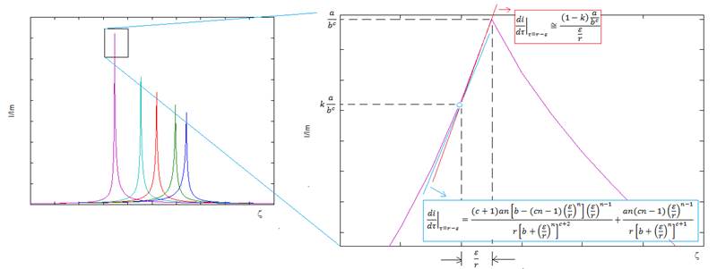 Martínez et al. (2020) destacan que el valor de r tiene carácter regional y, a la vez, probabilístico, pues depende de parámetros asociados con las curvas IDF. También está determinado por los niveles de aproximación prestablecidos por los coeficientes ε y k. Esto dificulta la determinación de r a través de las ecuaciones (9) u (11), porque los parámetros ε y k están correlacionados. Por tal razón, en la vecindad de r se diferencia la Ecuación (4) respecto a ( y se evalúa para ( = r - ε, es decir: