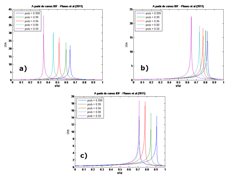 Figura 4 Hietogramas adimensionales para las probabilidades de ocurrencia de: a) SITLM; b) STNC; c) STC.