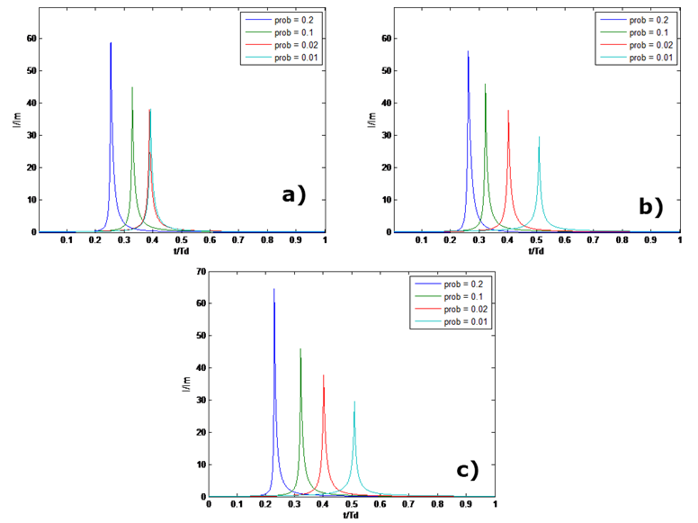 Como se aprecia en las Figura 4 (a-c), de acuerdo con Chow et al. (1994), para prob < 0.94, los SITLM tienden a ser de tipo avanzado, ya que r < 0.5, lo cual significa que la intensidad máxima ocurre antes del punto medio de duración total de la tormenta. En el resto de las probabilidades y tipos de sistemas (STNC y STC), debido a que r > 0.5, la intensidad máxima ocurre después de la mitad de duración de la tormenta y por tanto los sistemas son de tipo retardado (Figura 4). Otro aspecto de interés es que en el rango de probabilidades analizado el coeficiente de avance de la tormenta para los sistemas tropicales ciclónicos y no ciclónicos es muy similar. Además, en términos adimensionales, las intensidades máximas son del mismo orden. Estos sistemas, como ya se explicó, se diferencian fundamentalmente en su potencial pluvial, así como la extensión del área que afectan.