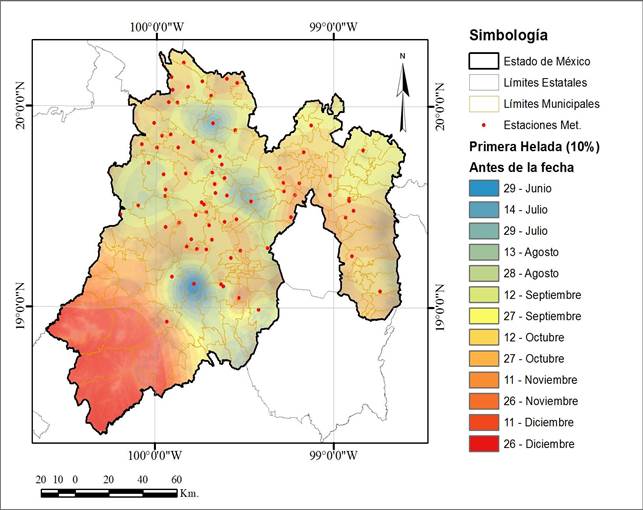 Se estimaron las fechas de ocurrencia de la primera y última helada con distintos niveles de riesgo enfocados en el cultivo del maíz; a partir de dichas fechas se estimó el periodo libre de heladas en el Estado de México y se construyeron mapas de riesgo para visualizar su distribución espacial. Esta metodología puede emplearse para generar información local y actualizada ajustando los niveles de riesgo α cuando éstos son conocidos para algún cultivo en particular.