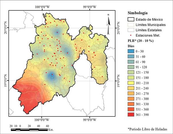Con base en las fechas de ocurrencia de la primera y última helada se estimó el periodo libre de heladas contemplando el 20 y 10 % (