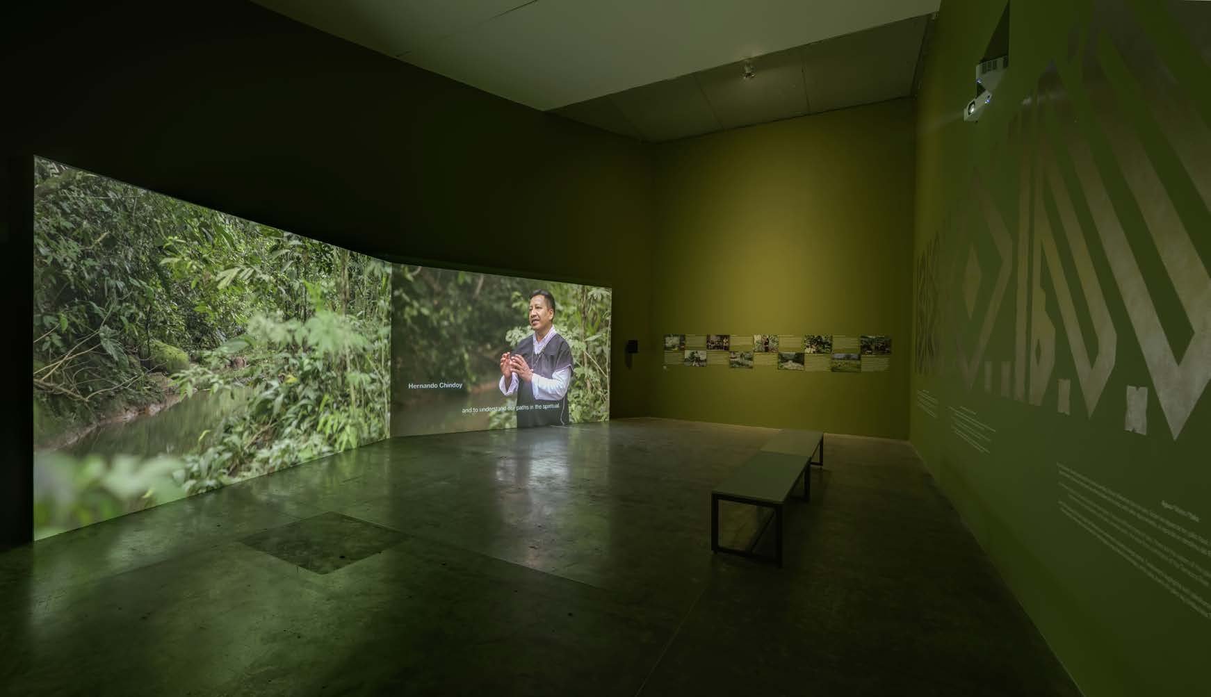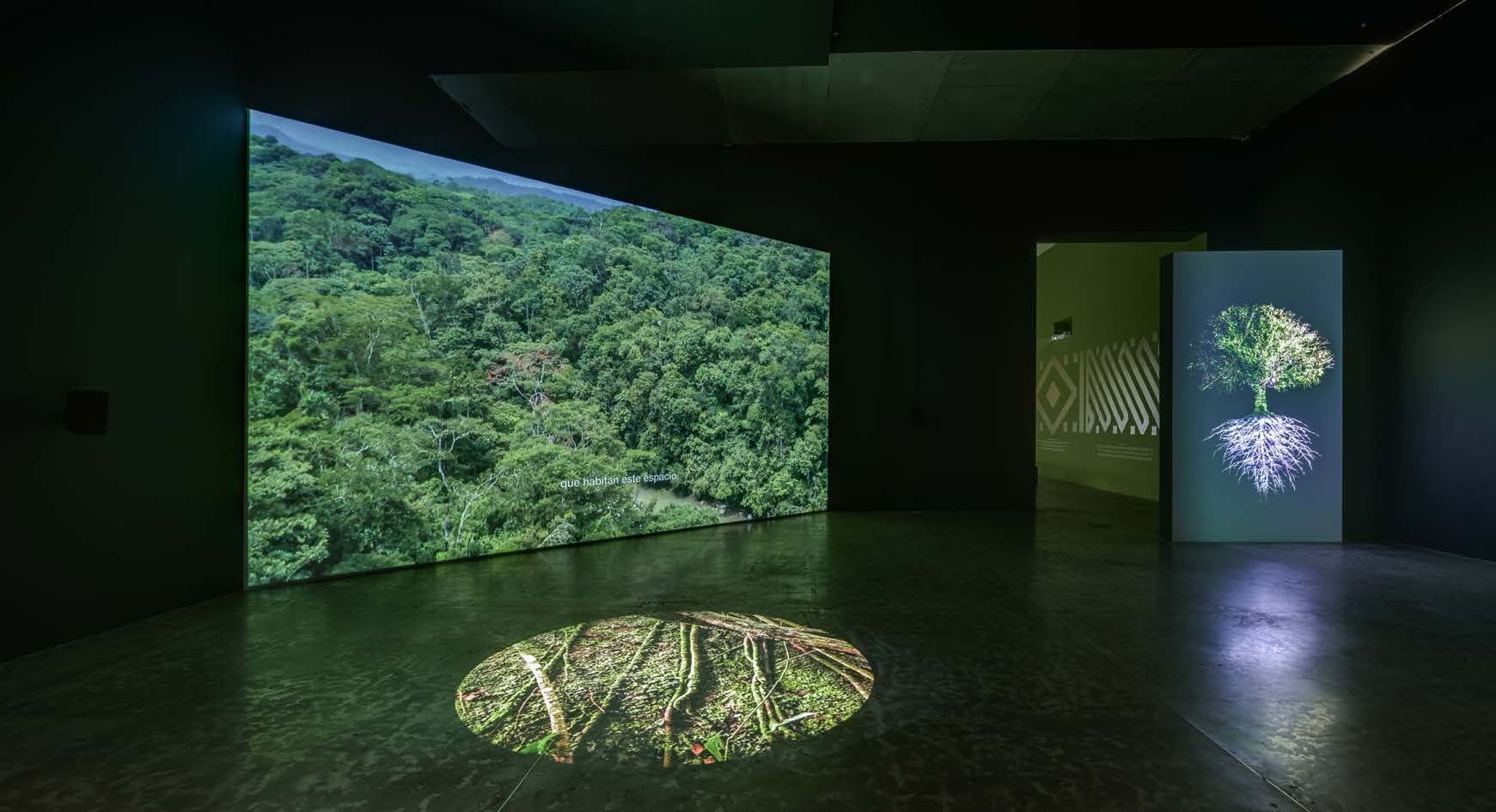 Las proyecciones de gran formato muestran imágenes aéreas de enormes extensiones de selvas espesas, con sutiles movimientos apenas perceptibles atraen la mirada curiosa que se deja cautivar por imágenes e historias vividas en esos territorios. La escala de las proyecciones interpela a la persona visitante, pero no sólo por la dimensión, sino también por los recursos de las voces de quienes, con sus testimonios y reflexiones, nos acompañan en el recorrido. Esto da la idea de que se busca potenciar estrategias que impliquen el cuerpo y la reflexión, para introducirlos al mundo místico de la naturaleza. Esta propuesta lleva a la corporalidad de la persona observadora a situarse entre lo macro y lo micro del mundo expuesto.