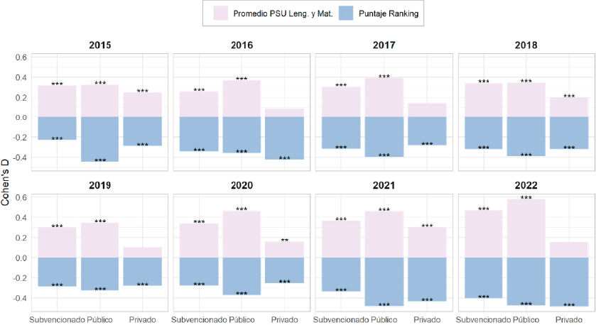 Para estudiar la brecha de género, se realizó una prueba de medias t-Welch para dos muestras independientes con distinta varianza: hombres y mujeres. Esta brecha se calculó para el promedio y desviación estándar de los puntajes Promedio LYM y Ranking para cada uno de los años en cada categoría. Finalmente, para cuantificar e identificar las dimensiones con mayores brechas de género se calculó el estadístico d de Cohen, que mide el tamaño del efecto.