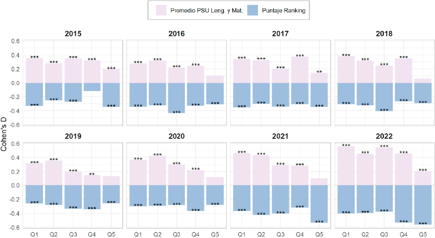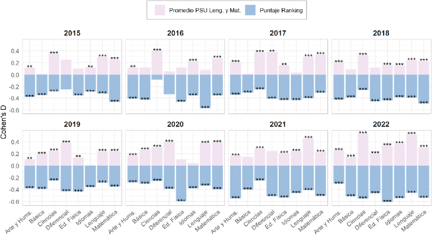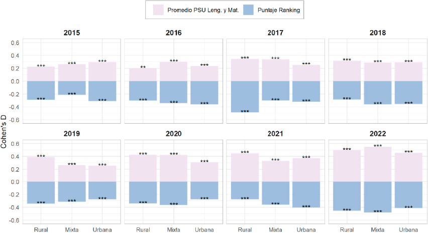 Sin embargo, por las características de codificación de los datos disponibles sólo es posible analizar esta brecha en la diferencia entre quienes se definen como “femenino” y “masculino”. Teniendo presente esta limitación, se analiza el despliegue de la brecha de género para sujetos definidos como hombres y mujeres entre los años 2015 y 2022, en los factores de selección de estos programas (tanto Puntaje Ranking como en pruebas obligatorias), calculando los tamaños del efecto de las brechas para las siguientes dimensiones: nivel socioeconómico, condición de ruralidad y área de especialización, analizando su significancia y magnitud en el tiempo. Los dos primeros años del análisis se consideran como línea base antes de la implementación de la ley.
