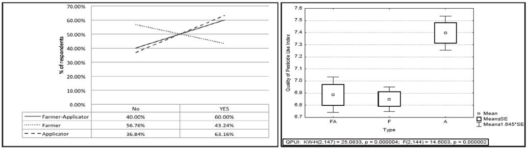 Las dos variables correlacionadas con mayor QPUI fueron edad (-0.22) y escolaridad (0.21), donde a mayor edad menor el QPUI y a mayor escolaridad mayor QPUI. El grupo de aplicadores presentó una media de edad de 37 años y una escolaridad de educación básica más un año de secundaria, mientras que los productores y productores-aplicadores tuvo una edad promedio de 57 y 51.7 años respectivamente, y una escolaridad de educación básica trunca.