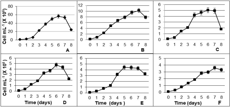 Figura 1 Crecimiento de las microalgas bajo condiciones controladas de laboratorio. A) Synechococcus sp. (LPU-10), B) Dicrateria sp. (LPU-8), C) Chaetoceros sp. (LPU-2), D) Chaetoceros sp. (LPU-3), E) Chaetoceros sp. (LPU-4) and F) Isochrysis galbana. Los resultados representan la media ± SDs.