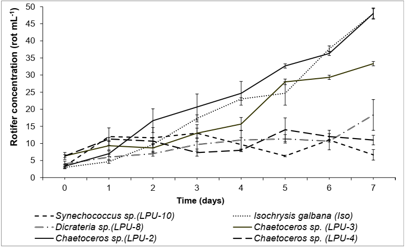 Los resultados de crecimiento poblacional del rotífero Brachionus plicatilis mostraron que las mejores (p>0.05) dietas para la alimentación fueron con Chaetoceros sp. (LPU-2) con concentraciones similares a la dieta control (Figura 2) y seguido de Cheatoceros sp. (LPU-3). Las dietas menos favorables fueron con Chaetoceros sp. (LPU-4 ), Chaetoceros sp.(LPU-4), Synechococcus sp. (LPU-10) y Dicrateria sp. (LPU-8) (Figura 2).