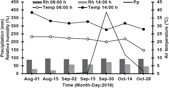 La amplia variabilidad de las condiciones ambientales que se presentaron durante el periodo de muestreo en diferentes fechas durante el periodo se debió principalmente a la heterogeneidad climática típica de la región semiárida de la parte noreste de México (González-Rodríguez et al., 2011a). En este sentido, se presentó una temperatura y una humedad relativa antes del amanecer (06:00 h) para la fecha más húmeda (Sep-30) de 20.0°C y 96 %, respectivamente, mientras para la fecha más seca (Ago-01), la temperatura fue de 23.2 °C y humedad relativa de 80 % (Figura 1). Por otro lado, al mediodía (14:00 h), durante la fecha más húmeda, la temperatura y humedad relativa registradas fueron de 27.6 °C y 73.0 %, respectivamente. En cambio, en el periodo más seco, se registró una temperatura de 38.4 °C y una humedad relativa de 30.0 % (Figura 1). La precipitación para la fecha húmeda fue de 385.4 mm, la cual se encuentra por encima de la reportada por González-Rodríguez et al. (2016). Dichos autores registraron para la fecha de muestreo más húmeda 295 mm, mientras que la fecha más seca registraron solo 0.2 mm (Figura 1), la cual se coincide con lo registrado por González-Rodríguez et al. (2018), los cuales reportan valores de 0.4 mm.