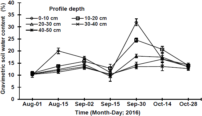 Figura 2 Contenido gravimétrico de la humedad en el suelo en cinco profundidades (cm) en diferentes fechas de muestreo. Los valores graficados representan la media ± error estándar de la media (n=4).