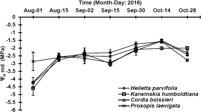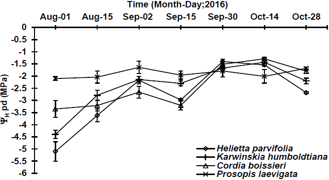 Con respecto al ΨHmd, diferencias significativas (p≤0.05) fueron detectadas entre las especies evaluadas en dos fechas de muestreo (Tabla 2). En relación con el comportamiento del ΨHmd, los valores fluctuaron de -1.5 MPa (P. laevigata) a -4.0 MPa (K. humboldtiana). Durante la fecha más húmeda (sep-30), el ΨHmd varió de -1.7 (H. parvifolia) a -2.1 MPa (C. boissieri) (Figura 4); durante la fecha más seca, el máximo fue de -2.9 MPa y el mínimo de -4.6 MPa para P. laevigata y K. humboldtiana, respectivamente (Figura 4).