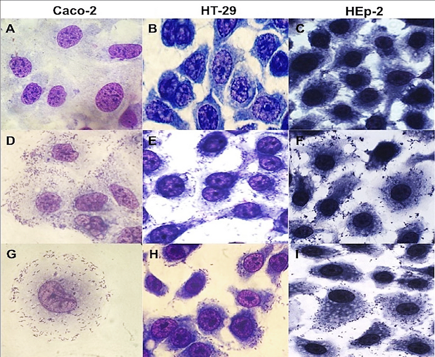 Las líneas celulares utilizadas fueron CaCo-2 (células de adenocarcinoma colorrectal humano), HT-29 (células de adenocarcinoma de colon humano), y HEp2 (células de carcinoma laríngeo humanos). Las células CaCo-2 y HT-29 se cultivaron como monocapas en frascos de 75 cm2 con medio Dulbecco Eagle modificado (DMEM) suplementado con suero bovino fetal al 10 % (v/v), aminoácidos no esenciales al 1 % (v/v) y solución de antibióticos al 1 % (v/v) (100 μg/mL de penicilina y 100 μg/ mL de estreptomicina). Las células HEp-2 se cultivaron en medio mínimo esencial (MEM) suplementado con suero bovino fetal al 10 % (v/v), L-glutamina 2 mM, y antibióticos al 1 % (v/v). Para los ensayos de adherencia e invasión, las células se cultivaron en DMEM y MEM sin antibióticos por 24 h. Las células se mantuvieron a 37 °C bajo 5 % de CO2.