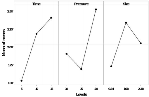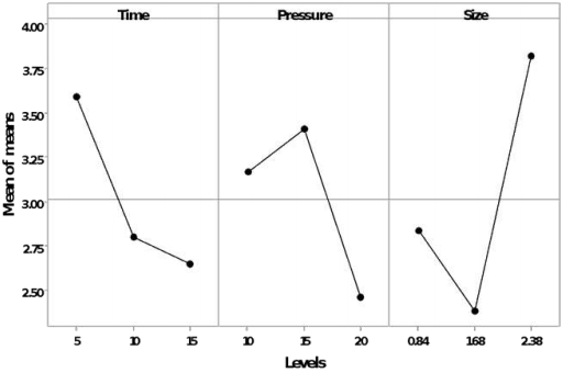 El proceso de optimización se realizó mediante un diseño factorial fraccionado con arreglos ortogonales, mediante el software Minitab 17.1.0. Se seleccionaron tres factores (tiempo, presión y tamaño de partícula) y se estableció una matriz ortogonal L-9 con tres niveles de variación por factor (Tabla 1).