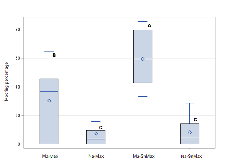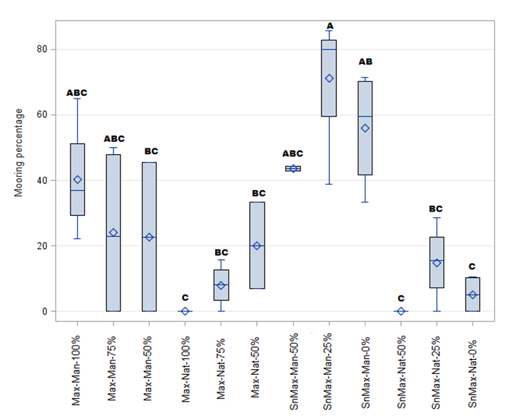 Trees without fungicide application (SnMax), manual pollination (Man) with pruning at 50, 25, and 0 %, as well as trees with natural pollination (Nat) with pruning at 25 and 0 %, were statistically significant, showing higher fruit mooring (38.12 %) compared to manual pollination treatments with 100 % and 75 % pruning and natural pollination with 100 %, 75 %, and 50 %, which did not moor the fruit (0 %) (Figure 2).