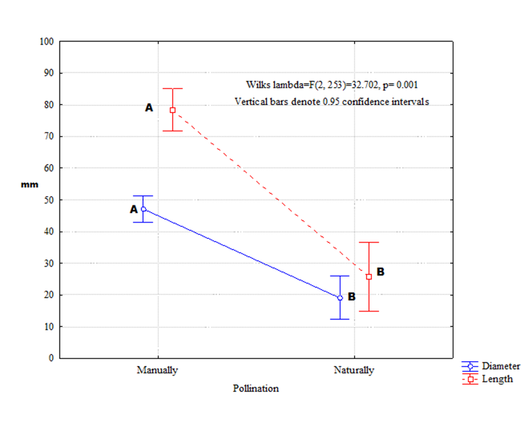 Hand-pollinated fruits were statistically significant, presenting a greater diameter (46.75 mm) and length (78.76 mm) compared to naturally pollinated fruits with means of 21.86 mm in diameter and 29.29 mm in length (Figure 3). Hand-pollinated fruits were found to be 53.23 % and 62.80 % larger in diameter and length development, respectively. Hand-pollination increases tree production and fruit quality by up to 50 % (Oliveira et al., 2005). Chávez & Sabando 2022), with the use of hand-pollination and the application of 2 % naphthaleneacetic acid, obtained diameters of 2.019 cm.