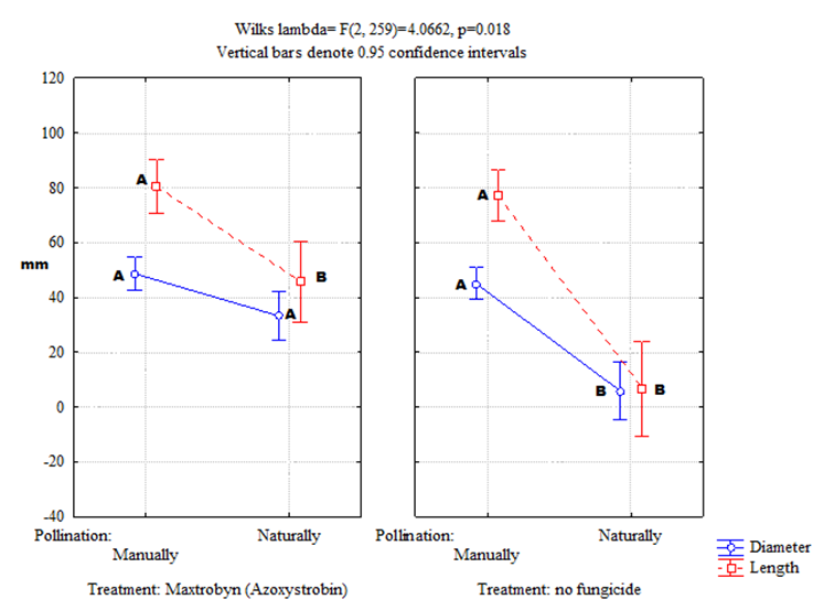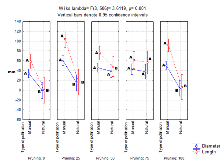 The data were analyzed using a randomized block design with a factorial arrangement, considering the factors of pollination type, pruning percentage, and fungicide application. Analysis of variance (ANOVA) and mean comparisons were performed with Tukey's test (α≤ 0.05) using the statistical package SAS (Statistical Analysis System).
