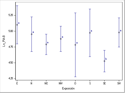 La influencia de la exposición del sitio sobre Ln_PIAB resultó significativa (P = 0.014). El efecto de la exposición SE difiere en la respuesta del crecimiento (Ln_PIAB), ya que fue menor que el resto de las exposiciones (Figura 4). En el caso de la especie, la prueba no mostró variación significativa en el Ln_PIAB (P > 0.1854).