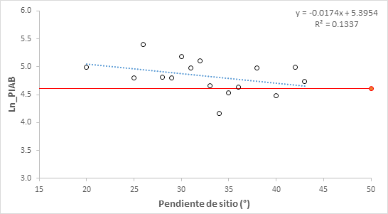 Figura 5 Regresión del logaritmo del porcentaje de incremento de área basal (Ln_PIAB) en especies de Pinus contra los valores promedio de la pendiente del sitio.