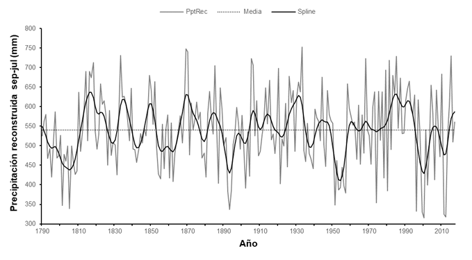 La Figura 5 muestra que la reconstrucción de la precipitación se extiende de 1790 a 2015 con alta variación interanual y multianual. Los periodos secos detectados en la reconstrucción fueron de 1795 a 1809, 1854 a 1864, 1892 a 1896, 1951 a 1957, 1996 a 2003 y 2011 a 2013, donde los años más secos (una desviación estándar por debajo de la media, estimada en 540.2 mm del periodo septiembre-julio) se presentaron en 1801, 1805, 1887, 1893, 1894, 1902, 1921, 1951, 1957, 1974, 1980, 1996, 1999, 2000, 2011 y 2012. Los periodos más húmedos ocurrieron de 1812 a 1825, 1832 a 1839, 1848 a 1852, 1866 a 1875, 1928 a 1933 y de 1982 a 1993, con los años más húmedos (una desviación estándar por encima de la media) en 1818, 1833, 1869, 1870, 1885, 1905, 1906, 1920, 1933, 1968, 1981, 1985 y 2015.