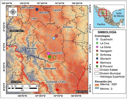 En el suroeste del estado de Chihuahua se ubicaron ocho sitios de muestreo; los parajes seleccionados poseen vegetación de bosque mixto templado con dominancia de especies de pino y encino; en dos de ellos domina Pinus lumholtzii B. L. Rob. & Fernald, tres más con Pinus arizonica Engelm., uno con Pinus leiophylla Schiede ex Schltdl. & Cham. y dos con Pseudotsuga menziesii (Mirb.) Franco (Cuadro 1). En estudios regionales, la integración de diversas especies en una cuenca o región hidrológica permite captar las fluctuaciones hidroclimáticas con mayor veracidad y fundamentan la influencia que los fenómenos circulatorios de carácter global ejercen (Woodhouse & Lukas, 2006).