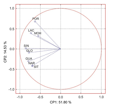 De acuerdo con el análisis de componentes principales mostrado en la Figura 3, el primer componente explica 51.8 % de la varianza común, con un eigenvalue de 4.5, mientras que los componentes 2 y 3 aportaron 14.5 y 10.2 % de la varianza, respectivamente, lo que representa 76.5 % de la varianza total acumulada. Las series MOH y POR mostraron comportamiento distinto al resto de las cronologías; por tal razón, para fines de integrar la cronología regional, se descartaron de dicho análisis. La serie LAC no se descartó debido a que presentó alta correlación en conjunto con las demás series lo que se traduce en una misma variabilidad.
