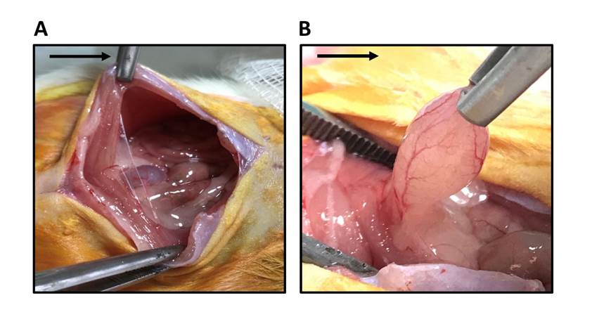 A and B: The bladder receives an infusion of 1.5 ml 0.9% saline solution. Vascular paths become apparent due to congestion due to the pinching process. Abdominal midline was incised, the arrow indicates the orientation.