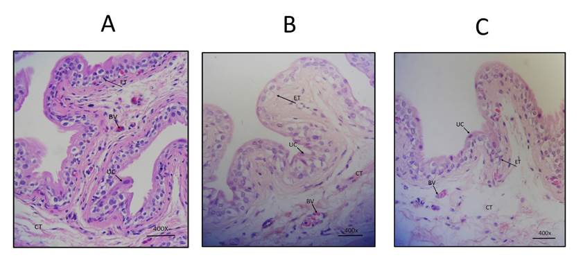 The histological analysis, rat bladder mucosa is identified, which is composed of transitional epithelium (uroepithelium or urothelium), integrated of a stratified epithelium composed of cubic or flat cells with a variable thickness of two to three layers; on the surface there is an umbrella-shaped layer of cells with an elliptical shape and an eosinophilic cytoplasm and a round nucleus. The lamina propria is made up of connective tissue with collagen fibers and blood vessels (Figure 3C).