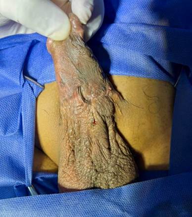 En el caso reportado, el paciente presentó siete intervenciones dentro de las cuales se usó colgajo de prepucio, injerto de mucosa oral y reparación simple con prepucio según referido por el paciente y las notas médicas. Clínicamente presentaba abundante tejido cicatrizal circunferencial al hipospadias, por lo que nuestras opciones terapéuticas deberían de incluir la colocación de un injerto que cubriera el defecto y un colgajo que aportará la irrigación para dicho injerto, esto nos llevó a tomar la decisión de realizar esta técnica.