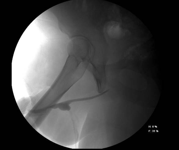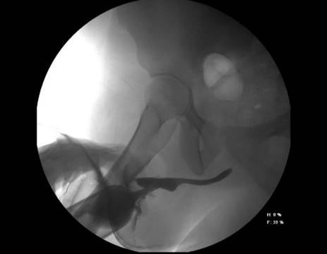Figura 2 Se observa fuga de medio de contraste a nivel central y permeabilidad de uretra distal y proximal a jeringa con medio de contraste