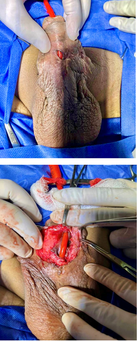 En la exploración física se observa presencia de hipospadias. La uretra peneana hasta el meato es permeable en dos puntos y se encontró tejido fibroso a la circunferencia. Se cánula la uretra proximal con paso de sonda sin resistencia. (Figura 3 y 4)