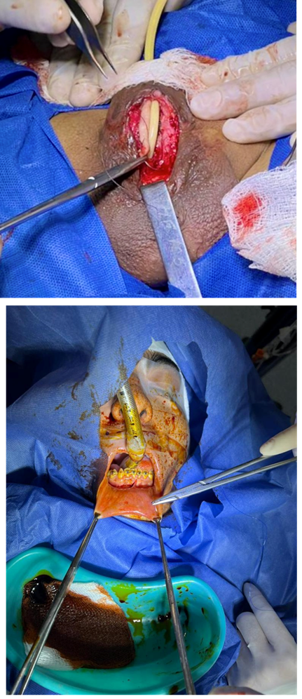 Se lleva a cabo una incisión en el prepucio en la localización del hipospadias, se realiza la hemi circuncisión del extremo proximal distal de este a nivel uretral, conservando el plato uretral, se libera de sus bordes laterales, a tomar el injerto de mucosa oral del labio inferior (Figura 5 y 6), 30 % más largo y ancho del que requerimos para cubrir el defecto. Realizamos la colocación de sonda transuretral y aplicación del injerto de mucosa oral realizando anastomosis con el plato uretral hasta que la porción proximal y distal de la uretra quedan herméticas. Se diseca el dartos a nivel escrotal y se asciende el mismo una vez liberado para cubrir el injerto de mucosa oral, terminando con el cierre de piel de prepucio y escroto.