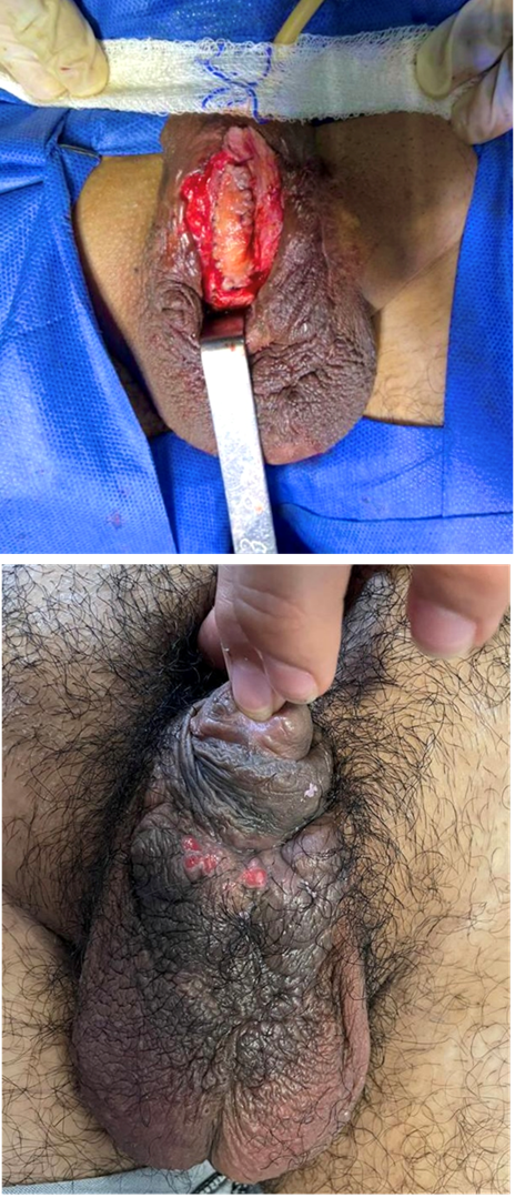 Paciente masculino de 21 años, con antecedente de hipospadias de uretra peneana distal, precedente de siete intervenciones quirúrgicas previas para corrección de hipospadias fallidas durante la niñez y adolescencia, acude a consulta por presentar micción a diferentes niveles de la uretra peneana distal (Figura 1), uretrocistografía del hipospadias (Figura 2) y solicita tratamiento para resolverlo.
