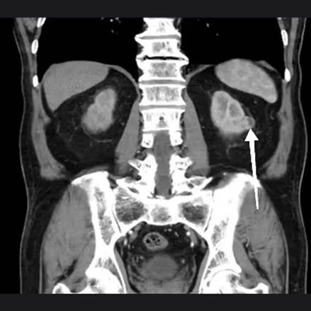 Unidad renal izquierda con imagen sugerente de tumoración parenquimatosa ipsilateral en borde lateral cercana a la línea interpolar (flecha blanca gruesa).